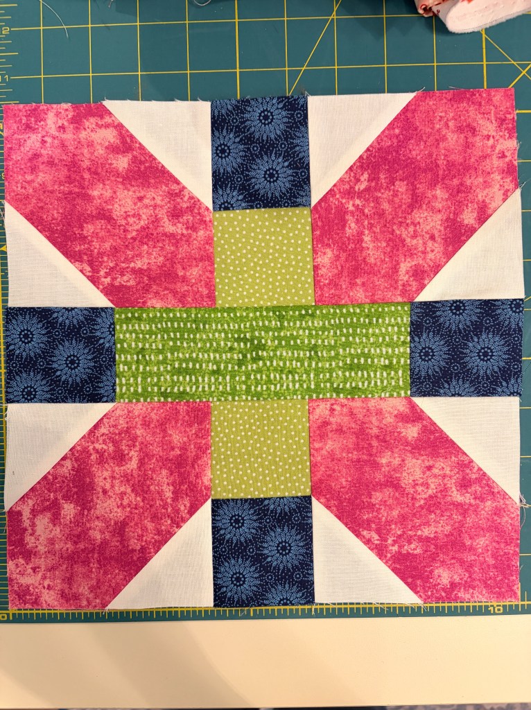 Each of the fabrics in this block tells a story. The green and pink are from recently completed projects The ivory is leftover from my Myrtle Beach Quilt Party quilt. The blue is from a class I took with Tara Miller last spring. The block isn’t hard to make. It can be completely scrappy or the more controlled scrappy look featured in this post. I look forward to making a serious dent in my stash fabric in 2026.