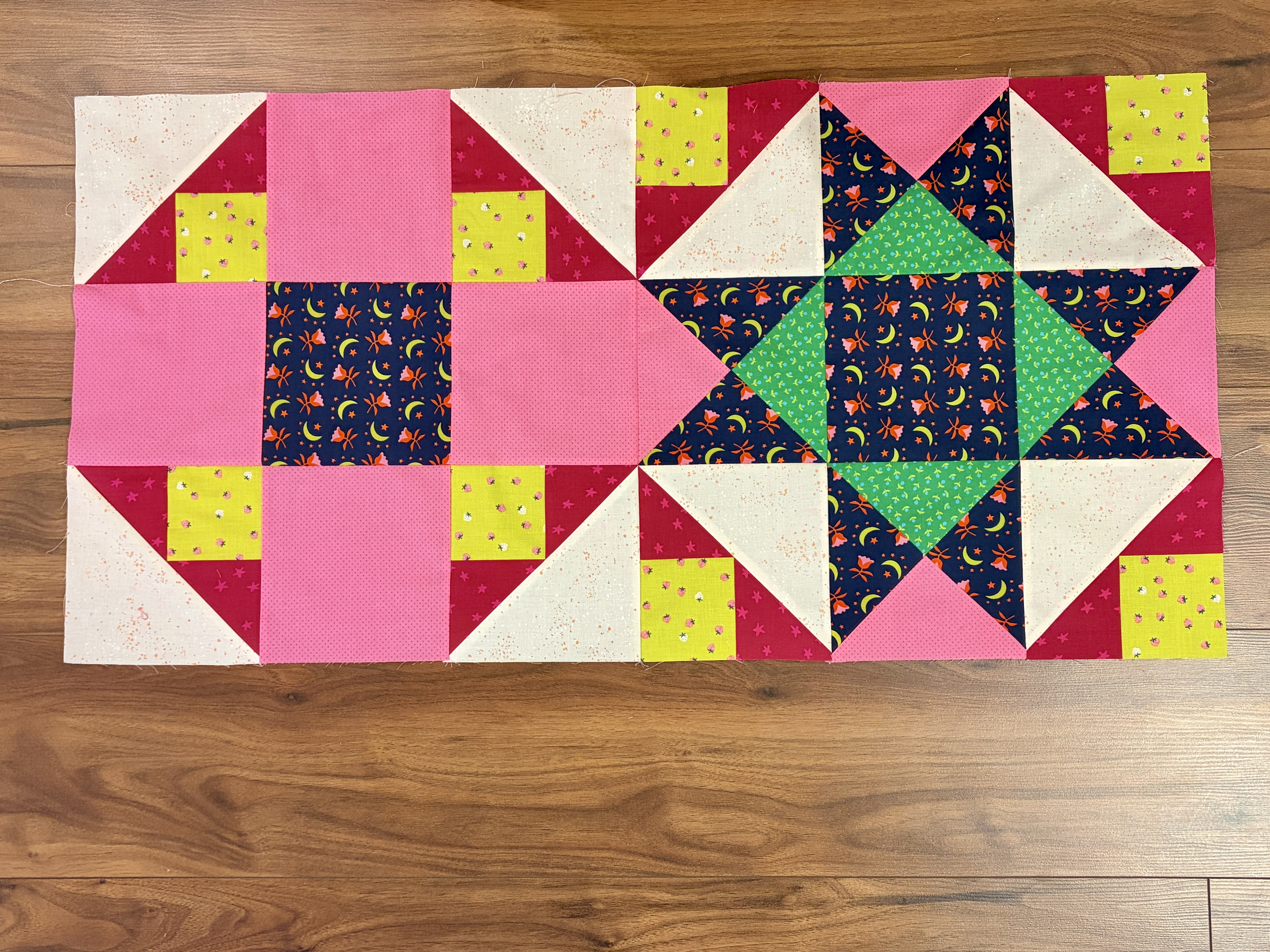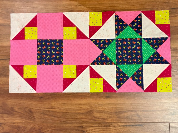 Each M50 Mystery quilt offers two layout options. The “Big Reveal” was on Wednesday. I chose the Torches layout, which is a 3×4 block layout with two borders. A partial row showing one of each block is below: