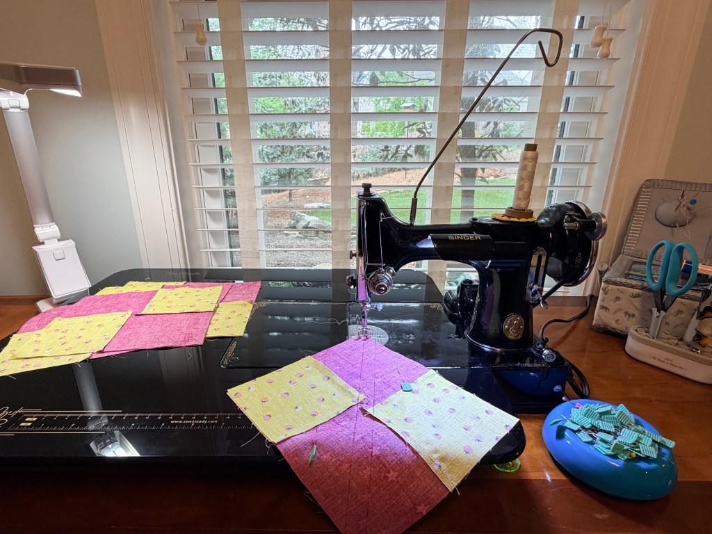 The fabrics are from Ruby Star Society and were curated by Sew Senoia specifically for this event. I purchased the fat quarter bundle during the Middle GA Shop Hop. As much as I loved the FQ bundle, I’m not so sure about the pepto pink. The borders should calm it down a good bit. I’ll reserve final judgement until the entire top is complete.