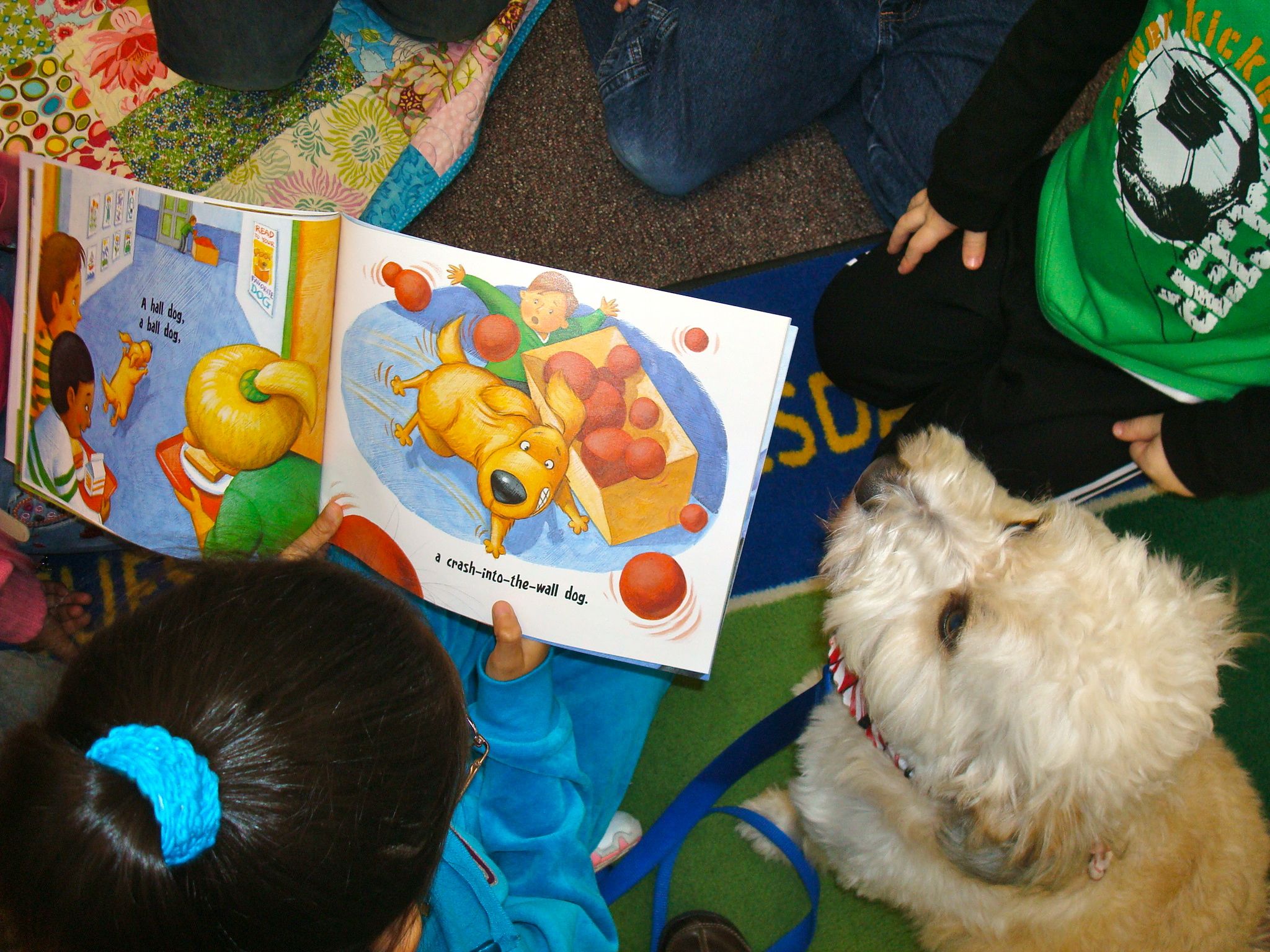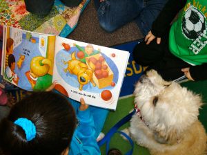 Yesterday, Boomer and I joined eight other READing Paws teams at the main library in Marietta to help celebrate Library Island – the library system’s end of summer celebration for kids who participated in the summer reading program. We had a great time meeting all of the kids and their parents. I returned home with one pooped puppy! A photographer from the local paper was there taking photos, so I ran to the store this morning to buy a Sunday paper. Nice article with pictures and kudos given to every group who appeared yesterday EXCEPT the reading dogs. Oh, well. Plenty of parents took pictures.
