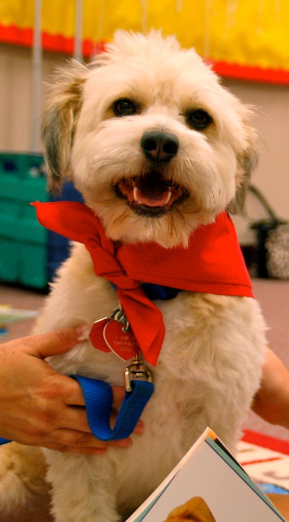 One of the parents from my elementary school was kind enough to snap pictures at our latest R.E.A.D. session @ the public library. If you look closely, you’ll see that Boomer has two sets of hands on him. No wonder he has such a great big smile on his face! He truly enjoys RE.A.D.ing with the kids every other week.