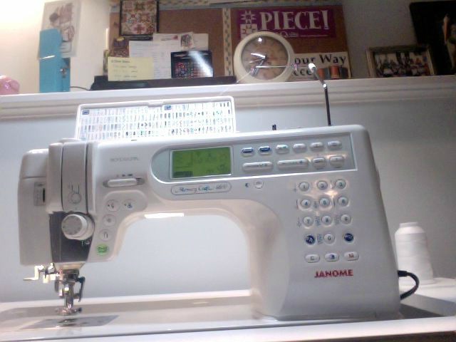 As you can see from the picture, the machine is already in her new home. I was smiling all the way home from Ashby’s. I’d made up my mind a couple of months ago that this would be my next machine and yes, I prefer it to the Horizon, which surprised Marc Briley, owner of Ashby Sewing Machines. We worked out a trade and price that was fair to both parties. It took about an hour to familiarize myself with the machine. I had hubby adjust the lift on the cabinet and attach the fold-up stitch guide.