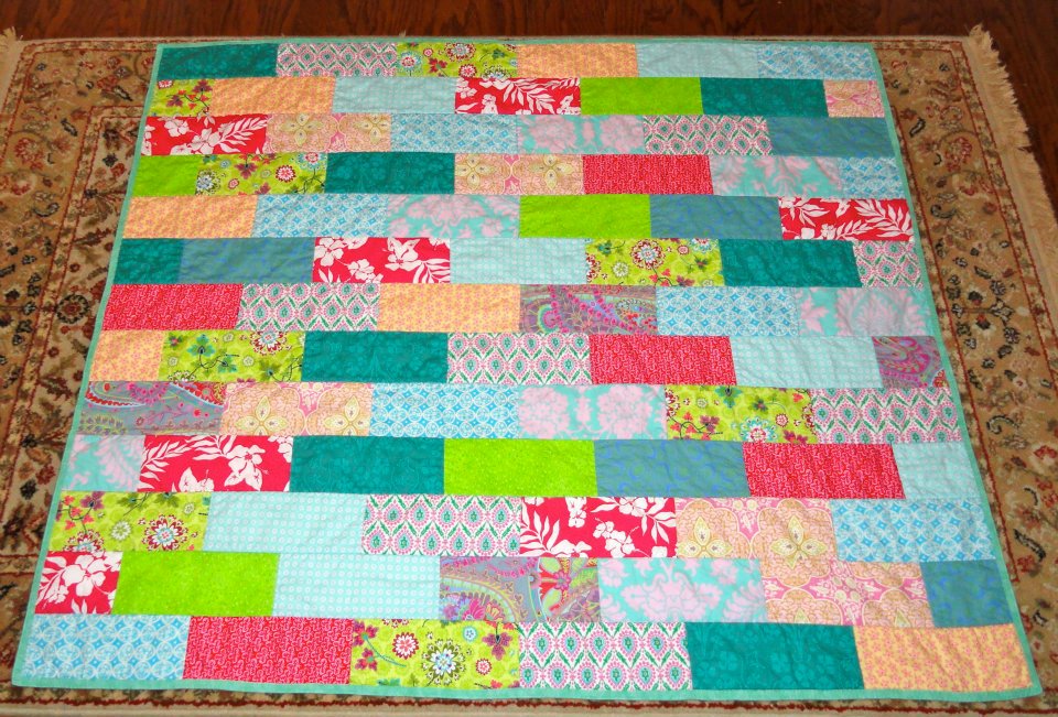 The design was inspired by a quilt I saw at Quilting by the Bay in Panama City and a book by Valori Wells I have at home. The pattern reminds me of subway tiles. I also included a wee bit of prized authentic Hawaiian fabric I have in my stash. it’s the hot pink and white floral. I used bamboo/cotton batting because I love the drape of that particular batting. The finished quilt is 50″x60″ and I simply stitched in the ditch and attached the binding by machine.