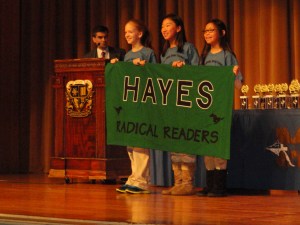Several posts ago, I mentioned that I had been asked to make the school spirit banner that our reading bowl team members would carry at the reading bowl competition. Here are three of the team members onstage during the parade of schools: