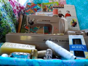 A sore jaw and head cold (thanks to the kiddos at school for sharing their germs) meant I stayed on the couch with my laptop most evenings. I did manage to sort through some of my pictures. I discovered this one that I took late last summer with my vintage toy sewing machine and some vintage notions: