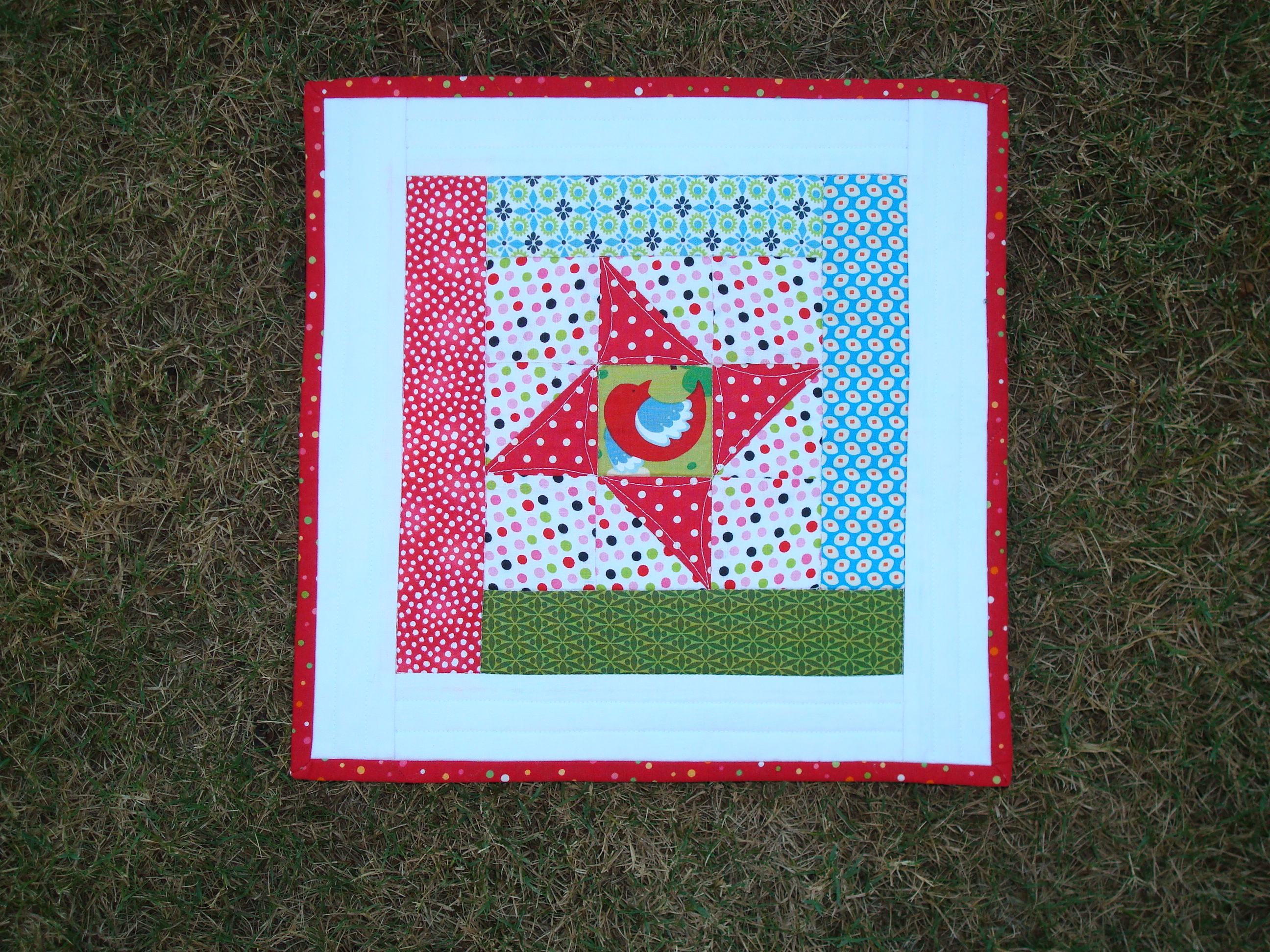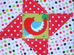 The only things I knew about Karen were that she liked the color red, polka dots and birds. No question the backing fabric would be a fussy cut of a Moda bird print I’d picked up over spring break. But what about the quilt top? I was inspired by a trio of mini-quilts in a recent issue of Stitch Craft Create. I had several bird fabrics in my scrap bins left over from previous projects. So I let my creative muse out of the bottle to play…