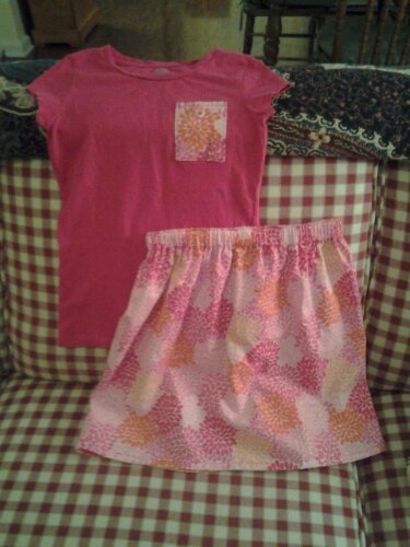 Need a quick, cute summer outfit for a little girl in your life? For about $10 and a little bit of time, you can make something similar. This outfit was made using a purchased t-shirt from Target ($5) and about 3/4 yard of fabric from Joann’s ($3.75). Of course, everything was purchased on sale!