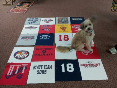 Here’s a photo of Boomer giving his seal of approval to Susan’s t-shirt quilt layout. We had a fun, relaxing time at Stitch N Quilt on Friday evening learning how to prepare our beloved t-shirts for cutting and sewing. This class will be offered again in February or March. Watch the shop calendar for our next class!