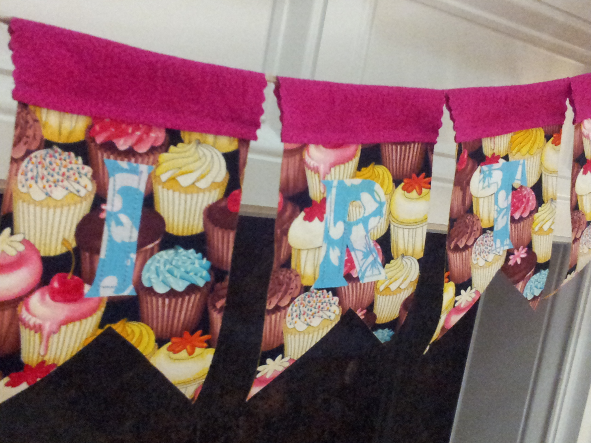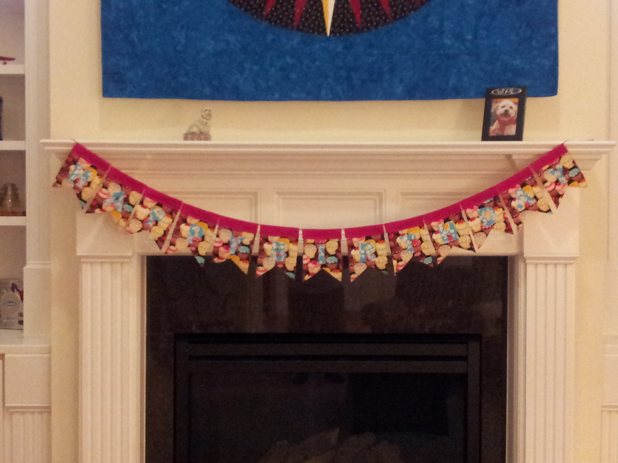 Construction notes: I used the large bunting template. Letters were printed at 66% of actual size. A 3″ narrow font letter set from Acc-u-cut or Ellison (they make die cutting machines) would make this project go even faster. Lots of fusing and just a little stitching. Letter were strung on twine – a heavier weight cording would have been nice – and taped to the mantel with blue painter’s tape. In hindsight, cupcake fabrics for the letters on a solid background or a dark solid on the cupcakes would’ve meant more contrast, but Mom loved it anyway. This project was TOTALLY from el stasho.
