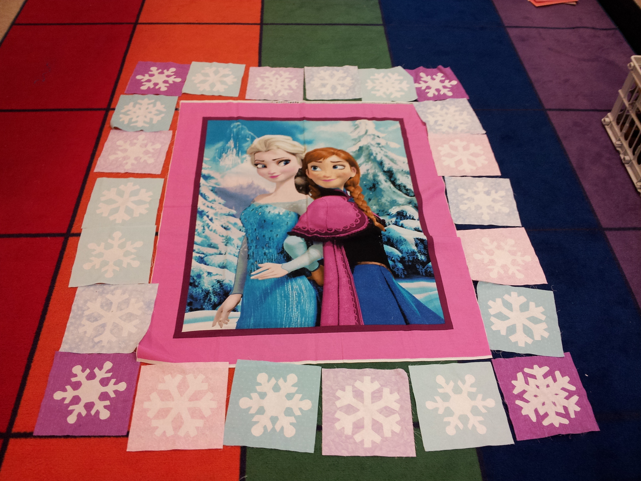 Crafty S.T.E.M.s have been helping me make a project quilt for the Media Center. It’s the Frozen quilt featured in the October issue of Fons & Porter’s Love of Quilting. The kids spent an entire club session making the 22 snowflake appliques required for the quilt. They gained first-hand knowledge of the least expensive (and most labor intensive) way to make fusible applique shapes. They also learned if you are willing to invest a few dollars, you can save a LOT of time by using a manual or electric die-cutting machine. Word to the wise: if you are on the fence about investing the $99 for the Accuquilt GO! 7″ snowflake die featured in the magazine – buy it! It’ll save you a great deal of time – or look on Etsy for folks who will prepare the appliques for a nominal fee.