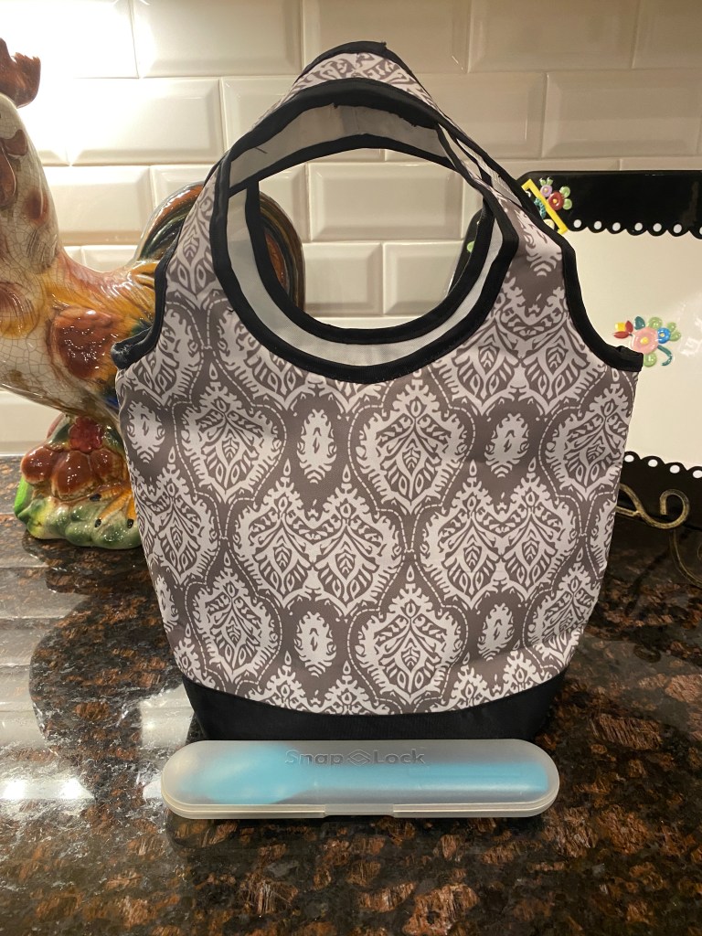 I actually thought my lunch bag days were behind me when I stopped teaching. Prior to COVID, we often did a potluck spread and shared snacks during classes and sew-ins. Nowadays, sew days and day-long classes necessitate bringing your own lunch, snacks and drinks. Glad I hung onto to this insulated lunch bag and accessories! It gets used every Friday for my sew day at the public library!