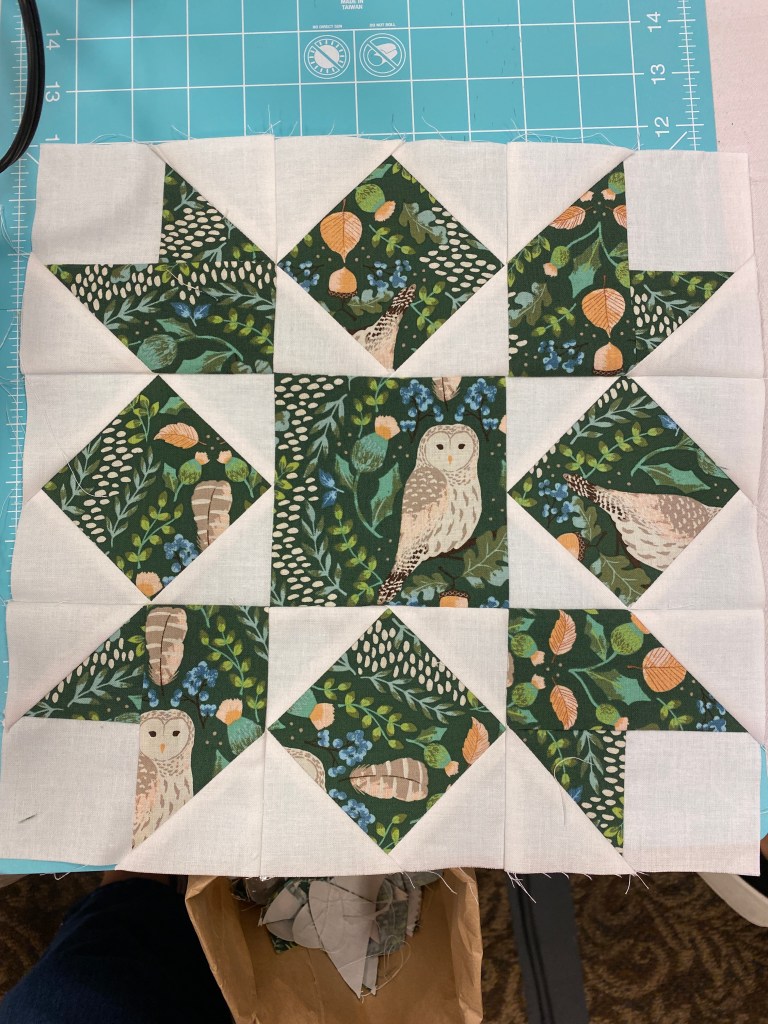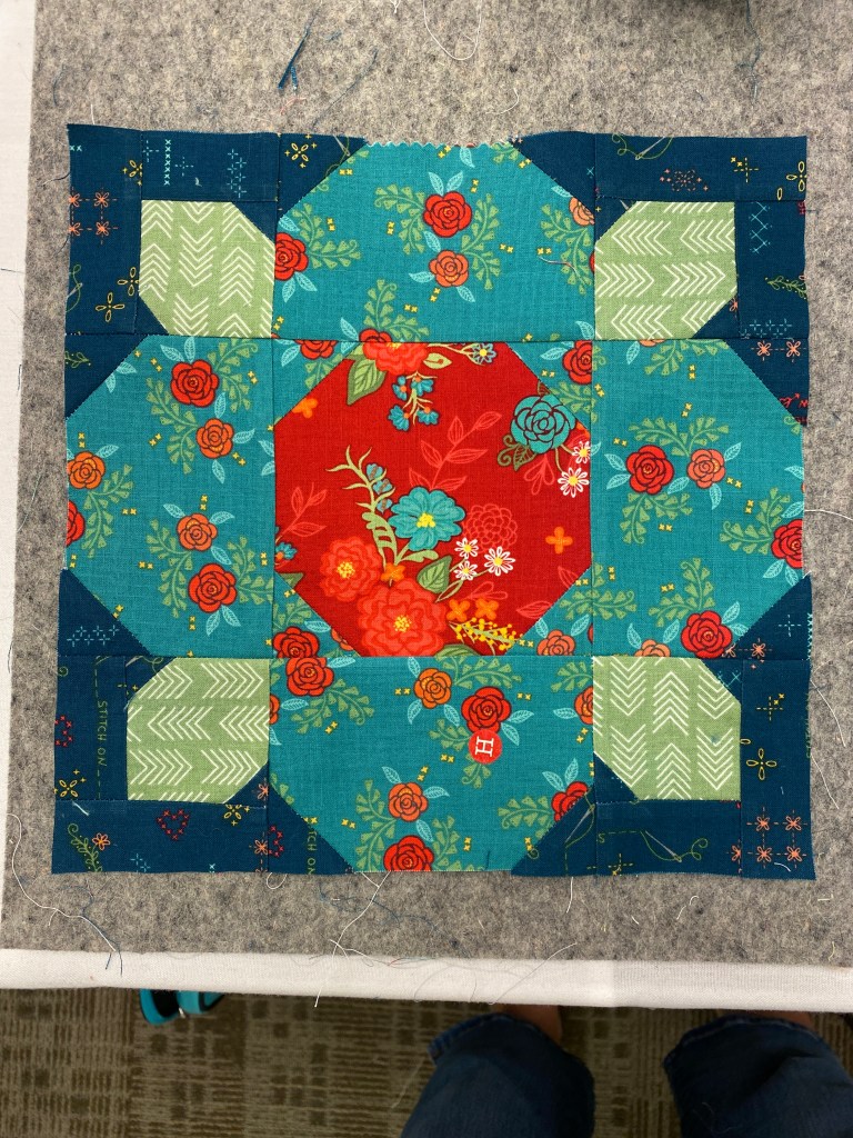 For my own teaching practice: Teach one block/technique at a time. Have a finished quilt available for students to examine/photograph and samples of each step in the process to pin on a flannel board (or portable design wall) and demo my process for tricky steps in small groups as students are ready. Plan on 1 hour of student work time per block. Bigger blocks (16″-20″) may require 2 hours. About 20 minutes before class ends, begin wrapping up and reviewing what students learned. Allow 5-10 minutes for Q&A.