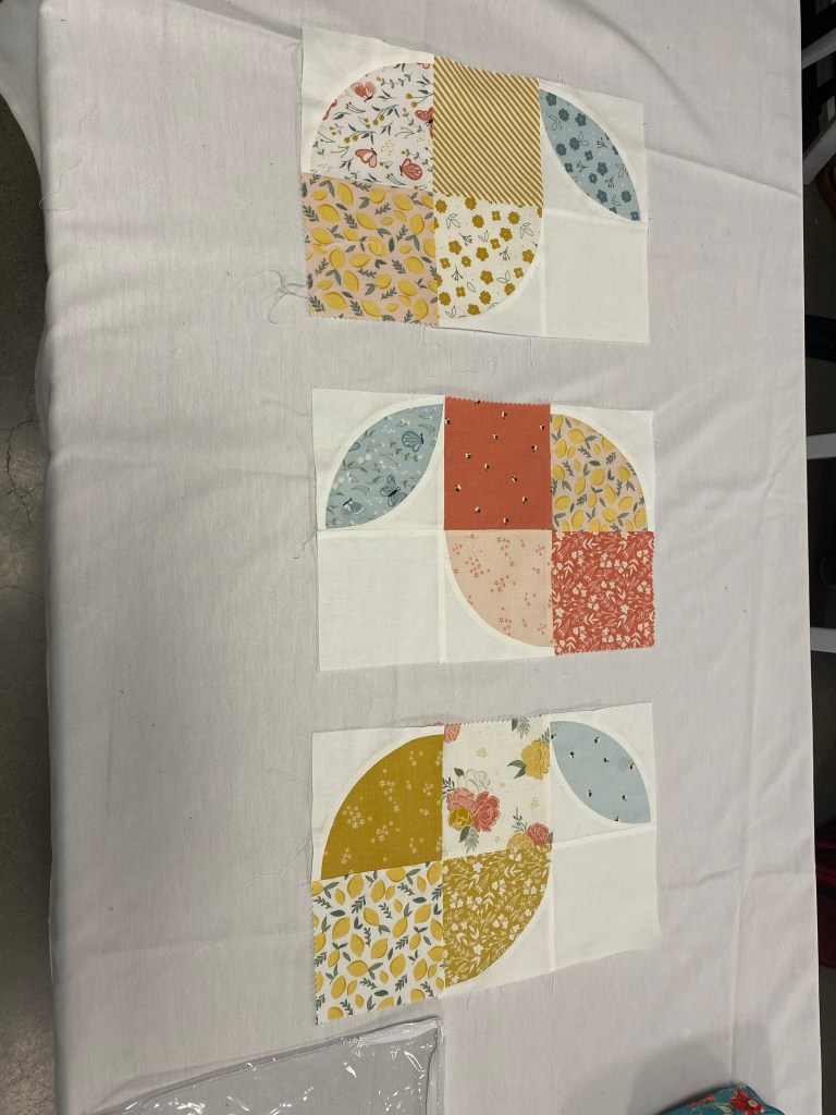 Memis Lemons: don’t be afraid of curved piecing, fewer pins actually make the process easier (pin middle and 2 sides only), make sure your middle creases match all the way across so your background isn’t sewn on wonky.