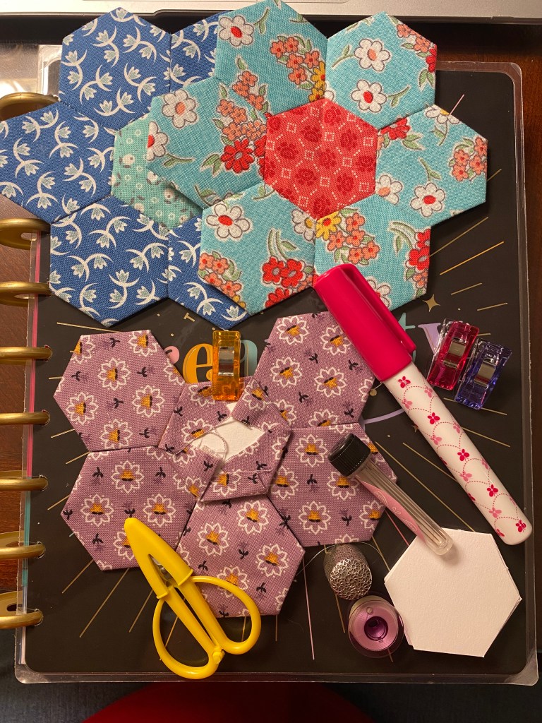 What will I do with all these hexie flower blocks? Appliqué them on placemats, potholders, zipper pouches, baby quilts, pillows, etc. I do not anticipate doing a complete Grandmother’s Flower Garden quilt by hand.