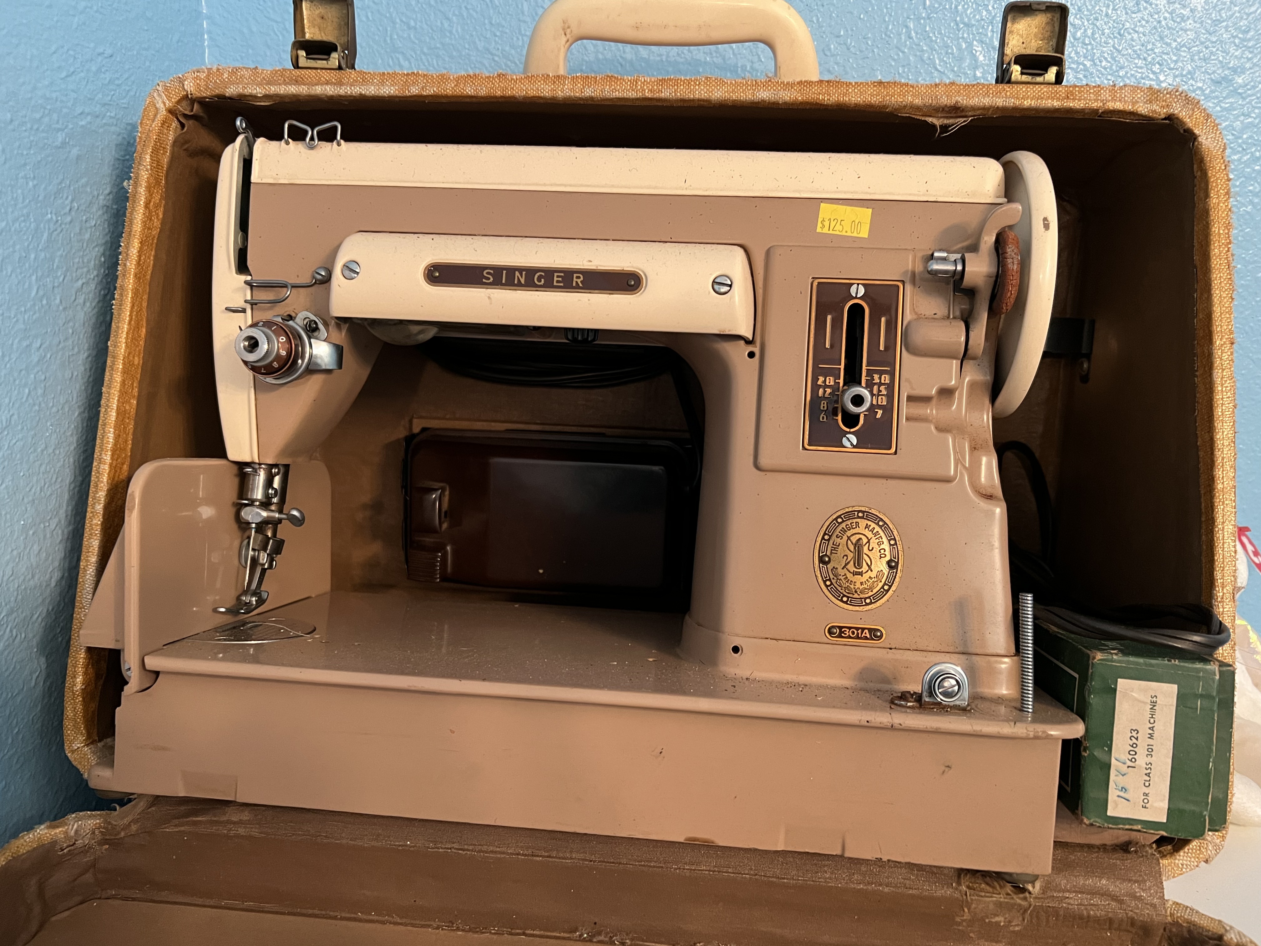 When my SIL and I attended the vintage sewing machine workshop back in August, we both remarked that we’d like to take one of Ray’s Singer 301 classes. Only one slight hiccup – she has a 301 (black long-bed) and I don’t. A lot of Featherweight owners also have a 301, but I didn’t feel the need to acquire one – unless an LBOW model (beige/white short bed) came my way at a really attractive price.