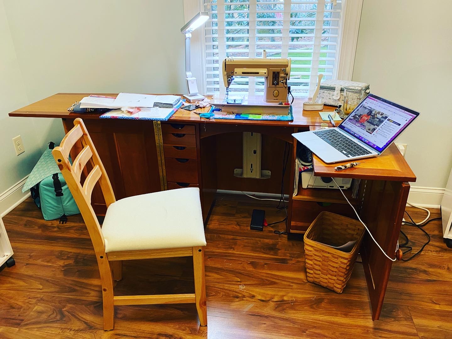 Sewing and quilting tend to be a solitary activity. I love to listen to audiobooks, podcasts and the radio when I’m working on a project. I’ll text pictures of my progress to a friend or two along the way. I don’t have a TV in my sewing room. I will bring the laptop to my sewing room for an event on Zoom, but the laptop normally stays in our home office because my husband and I both use the the laptop on a regular basis.