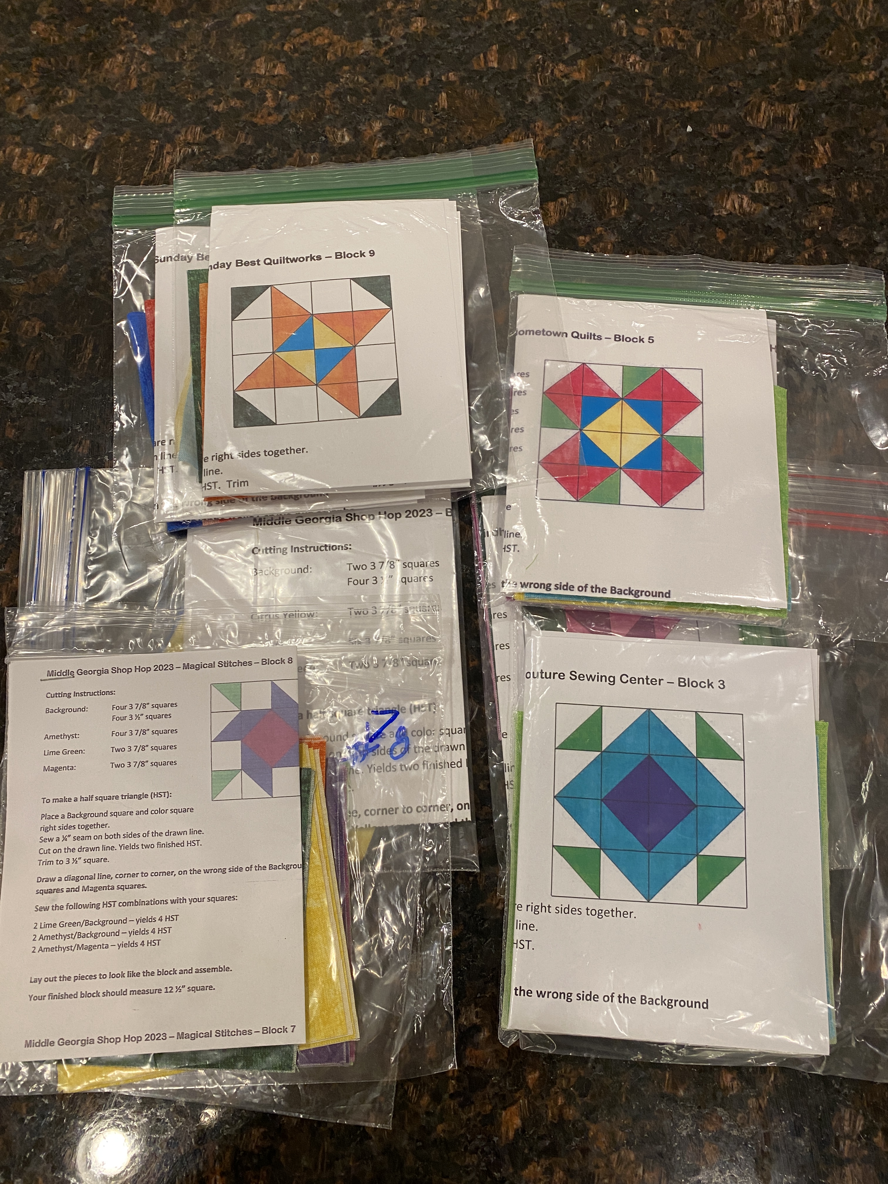 I did purchase the two shop hop blocks from each shop + a couple of items on my list. I selected a white-on-white print from my stash for the background fabric. I think it’s only fitting since this fabric came from a shop that was once part of the Middle Georgia Shop Hop! 🙂