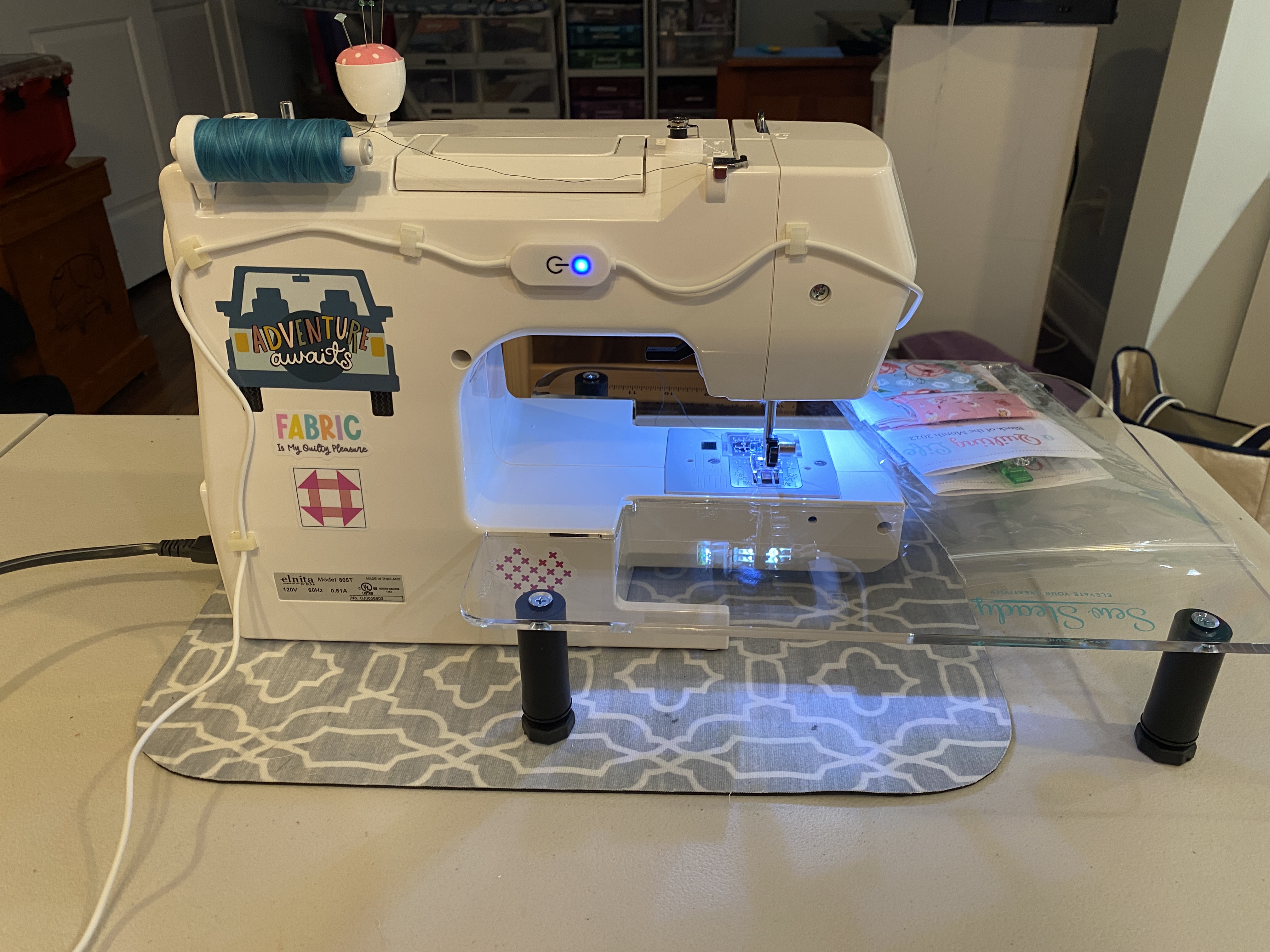Why all the fuss? I teach with this machine and students complained the Bendable Bright Light got in their way. The on/off button was also not working. I tried the new set-up out at my Friday Sew with Friends Day. Sweet! Plenty of light and the switch is easily accessible/dimmable to the desired amount of light. No more intense beam and glare like we had before. The kids should be happy. I know I am. This small hack now makes this sewing machine a true contender for air travel. The Elnita EC30 is a more versatile machine – and only about an inch wider than my Elna STAR. This means it’ll fit in the same rolling tote that I take on the plane.