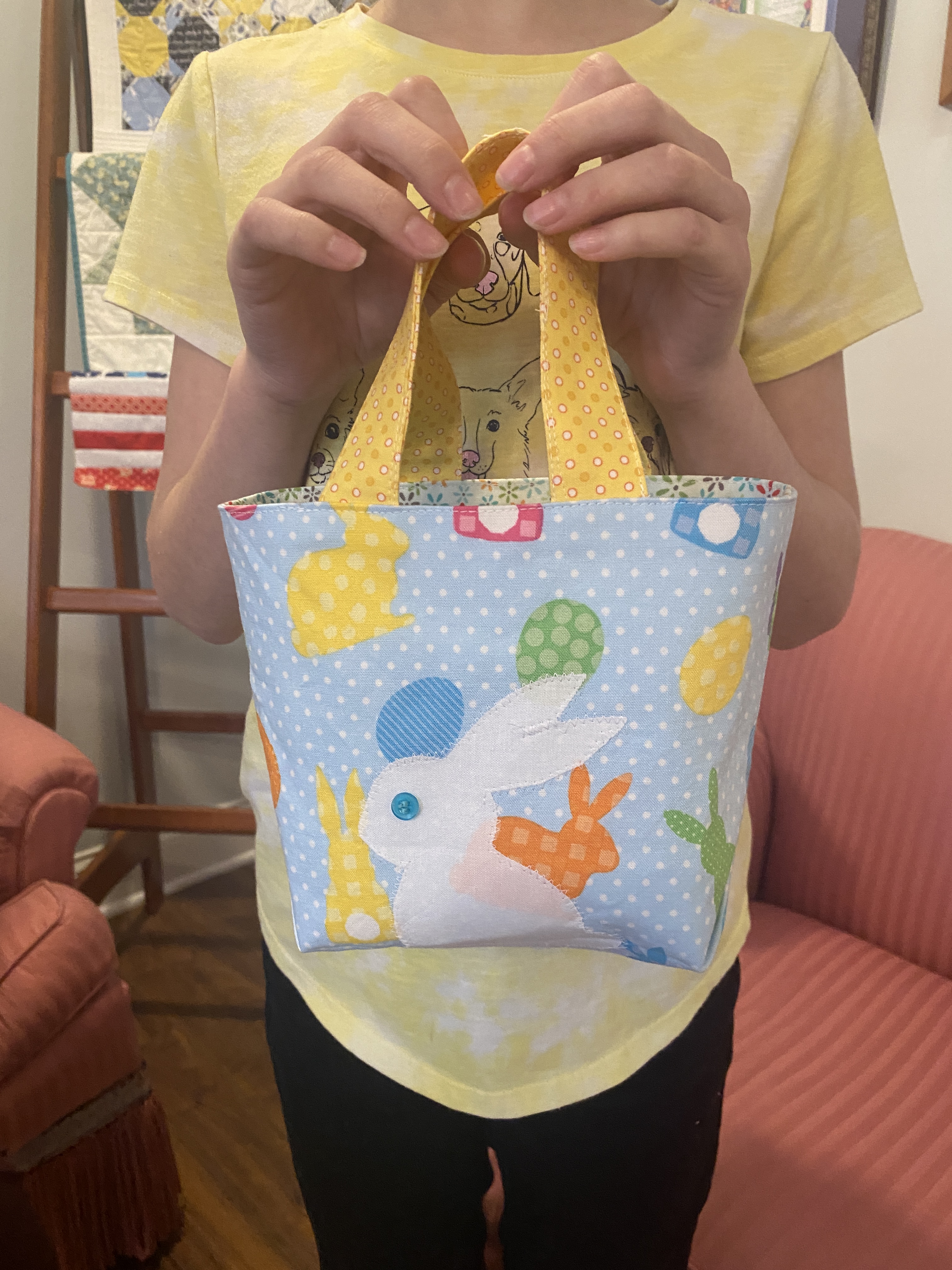 This is an Easter version of the Halloween and Christmas bags made by other students. Don’t you just love the bunny appliqué? The student placed her bunny exactly where she wanted it. Thread painting/decorative stitching some Easter grass would have been cute, too! No time for that today in our busy 90 minute session.
