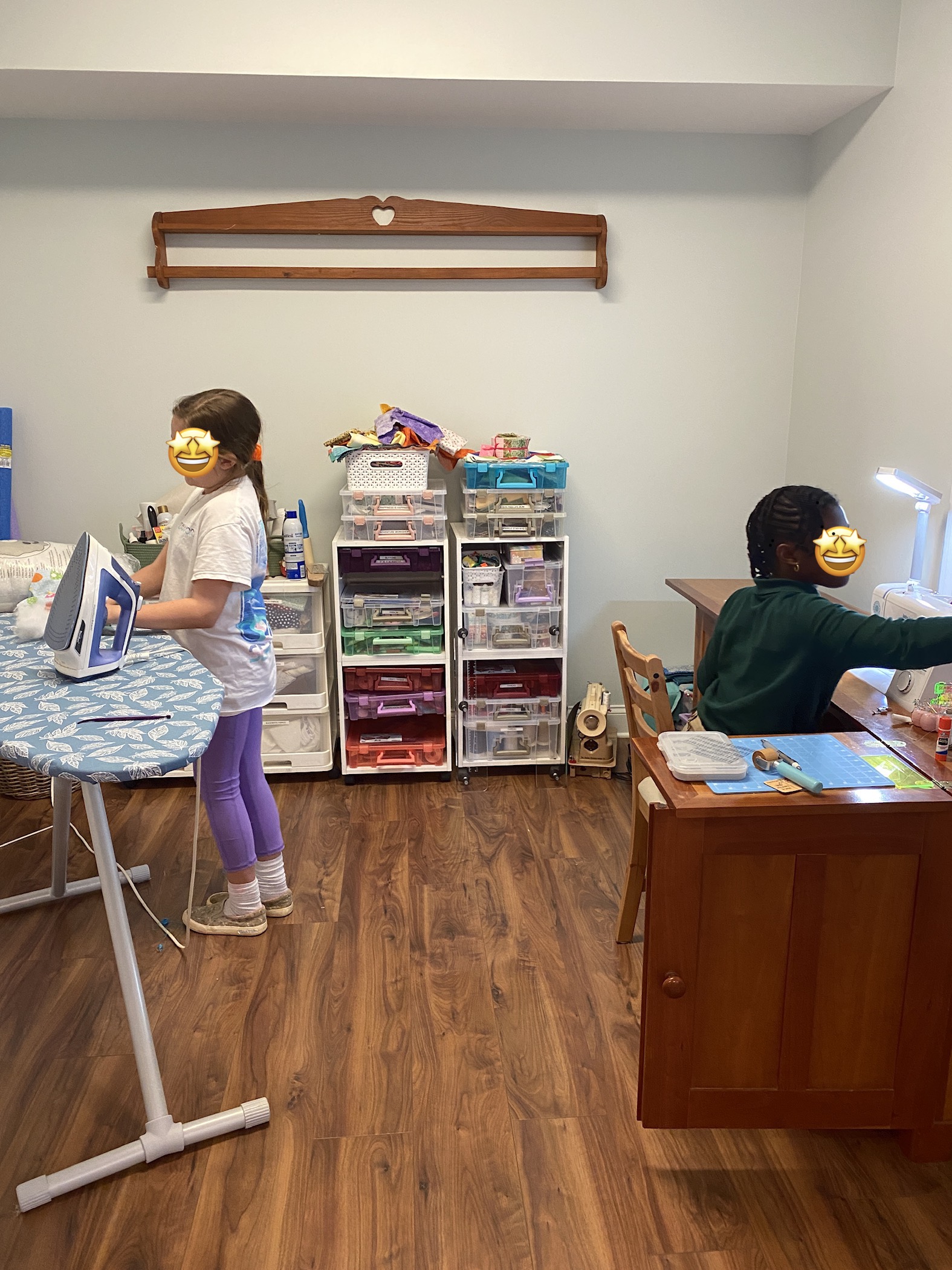 The girls selected fabric, trims and eyes for their glam bunnies. I had them make their pompom tails while I cut out the pattern. This is actually a good project for students to learn how to cut out a pattern. If we’d had more time, I would’ve had them do it. The girls are much more independent now with their sewing. All I have to do is monitor and reteach/redirect when necessary. Like me, stuffing is definitely not their favorite part of the process! About an hour later, the girls left with their bunnies.