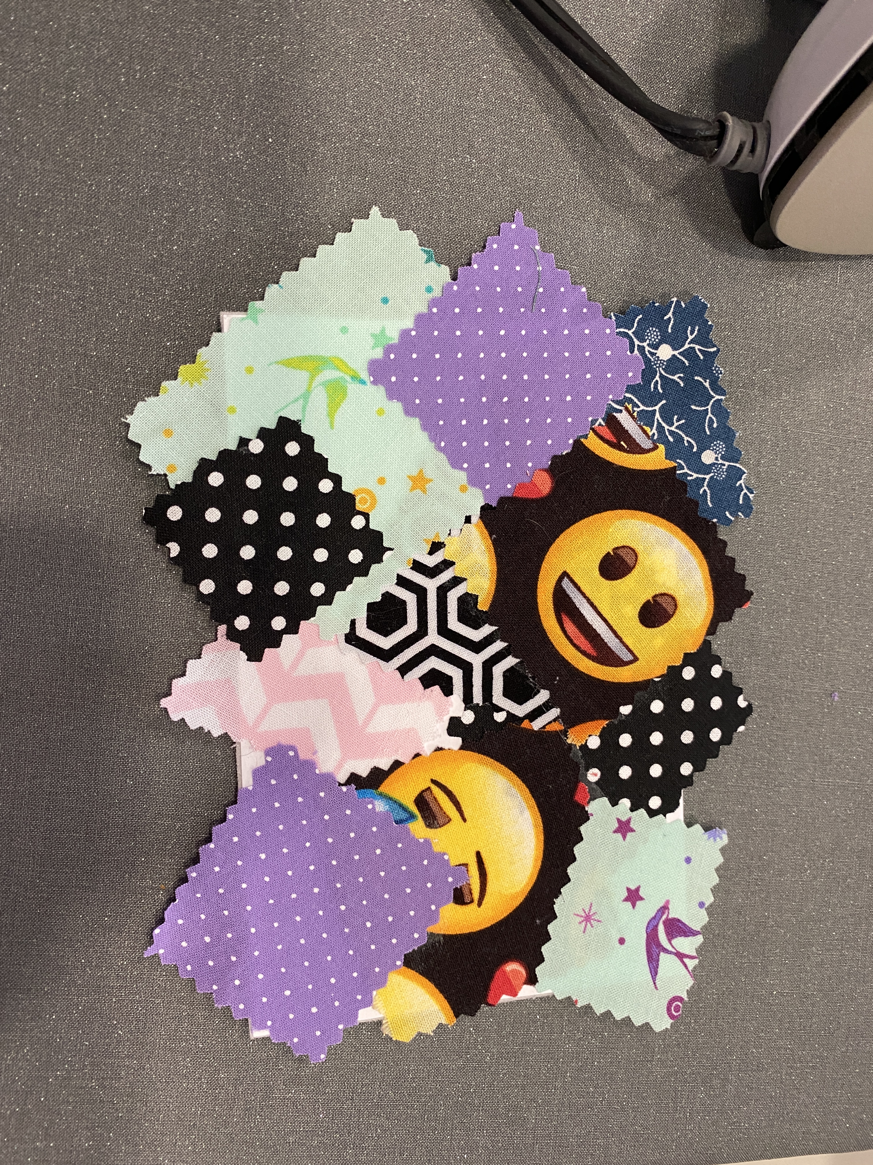 5. Apply fabric scraps in a collage or improv style to the cardstock side (not the fuzzy side). Tip: decide layout before applying glue stick to your fabrics. Be generous with the glue. Extend your design beyond the edges of the card. Press fabric scraps firmly to surface using your fingers.*