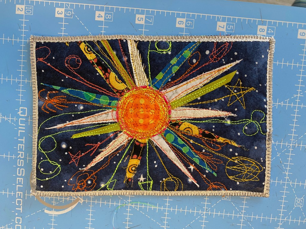 I guess the style would be loosely known as “mixed media” or “art quilt” – not a style I typically do. Now that I understand the design process and learned how to FMQ on my Elnita EC30, I’ll be able to construct future “art quilt” type cards much faster. It was also a LOT of fun and a great way to use up scraps.