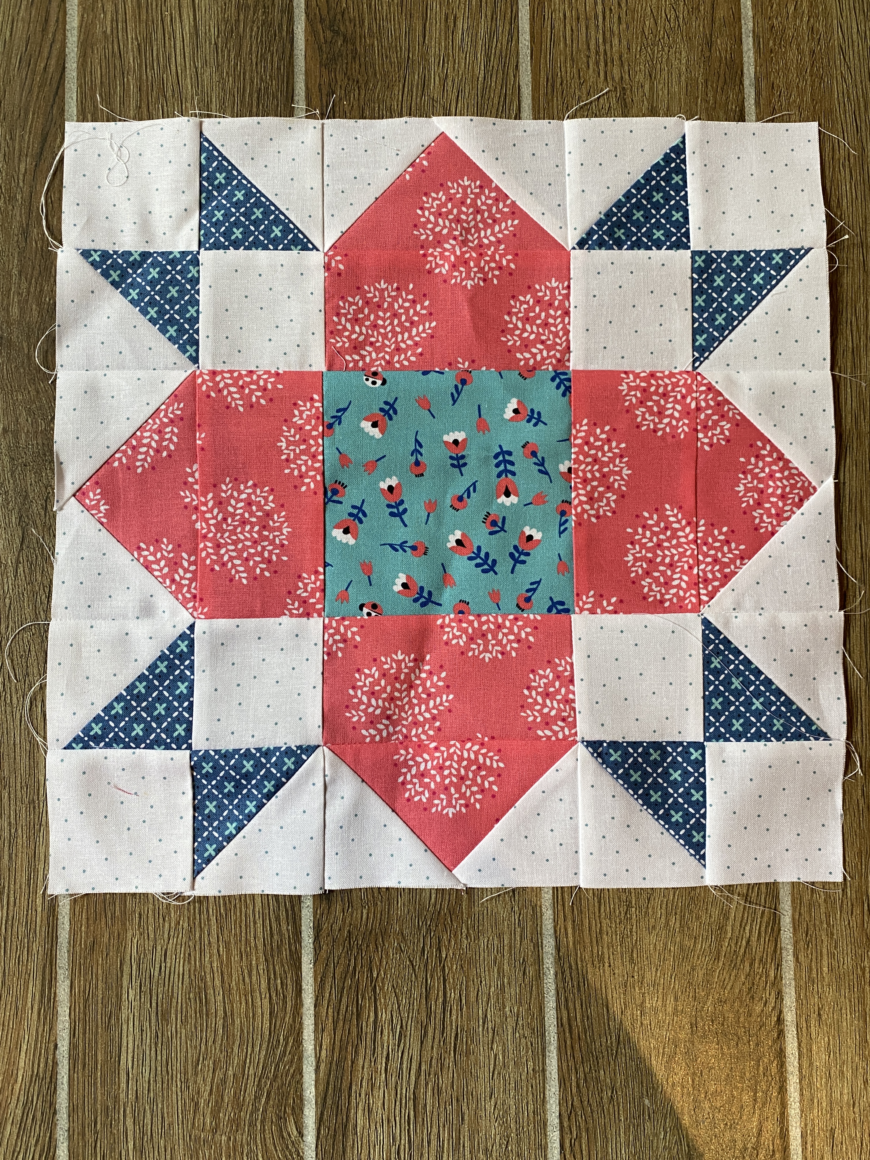 Or do what I did. I challenged myself to create my own version of the block. If you look closely, you’ll see it’s a a traditional 9 patch block with a little more pizzazz from the HST and FG units. It took a little while to do the math, but I pieced my block at my Friday sew day. I’m very happy with the result: