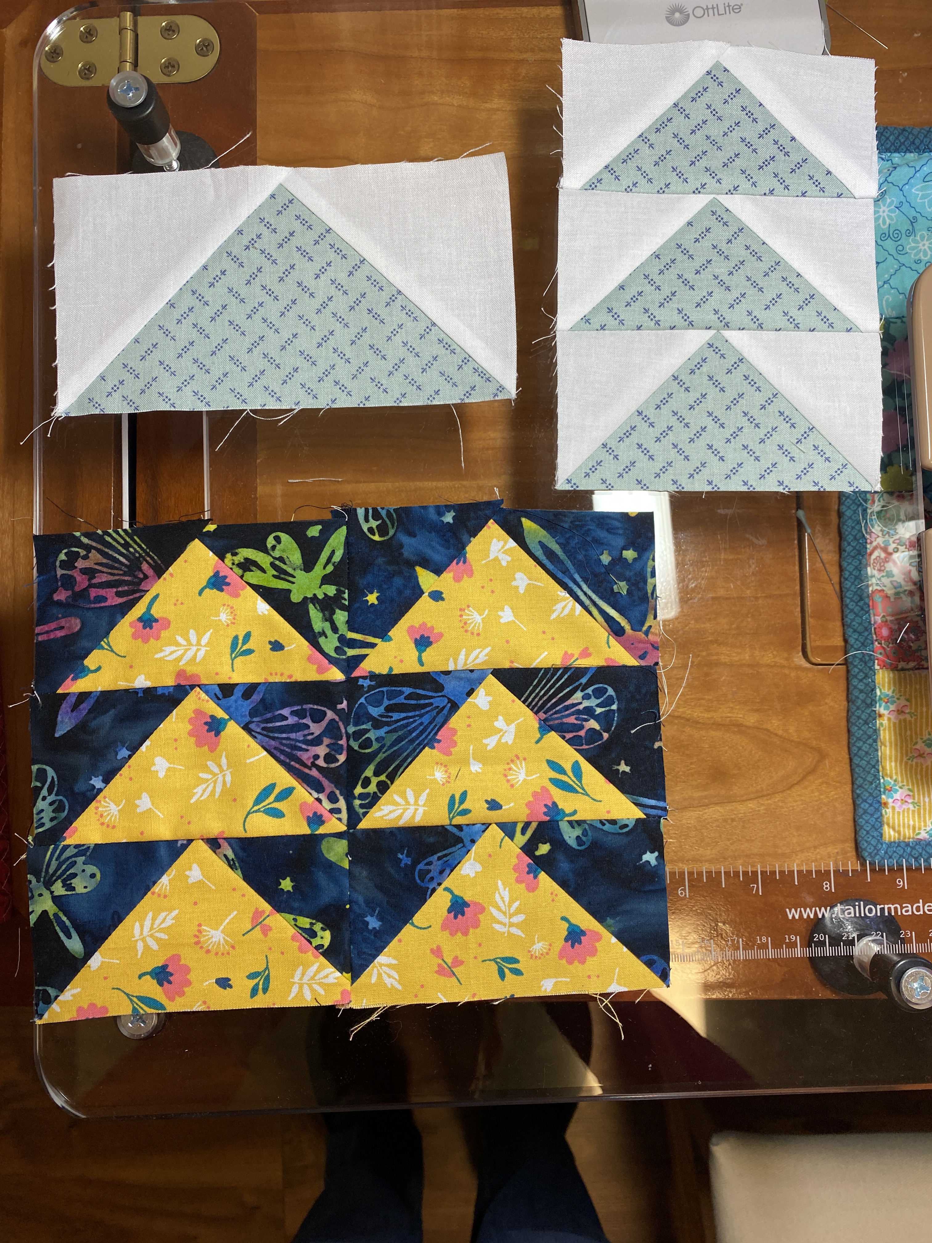 The ability to use strips to cut my FG blocks and minimize waste really, really appealed to me. However, I could not for the life of me get the hang of how to sew the blocks together so that they consistently came out (1) the correct size and (2) had a true 1/4″ seam left above the point. I watched several different videos and spent way too much time trying to figure out this method. The yellow/navy batik FG block is the result of this experiment. I had to sew the FG together using a 1/8″ seam allowance across the points. Not my preference. Several of my quilting friends swear by the Bonnie Hunter ruler for making FG, so perhaps I’ll try it again someday.