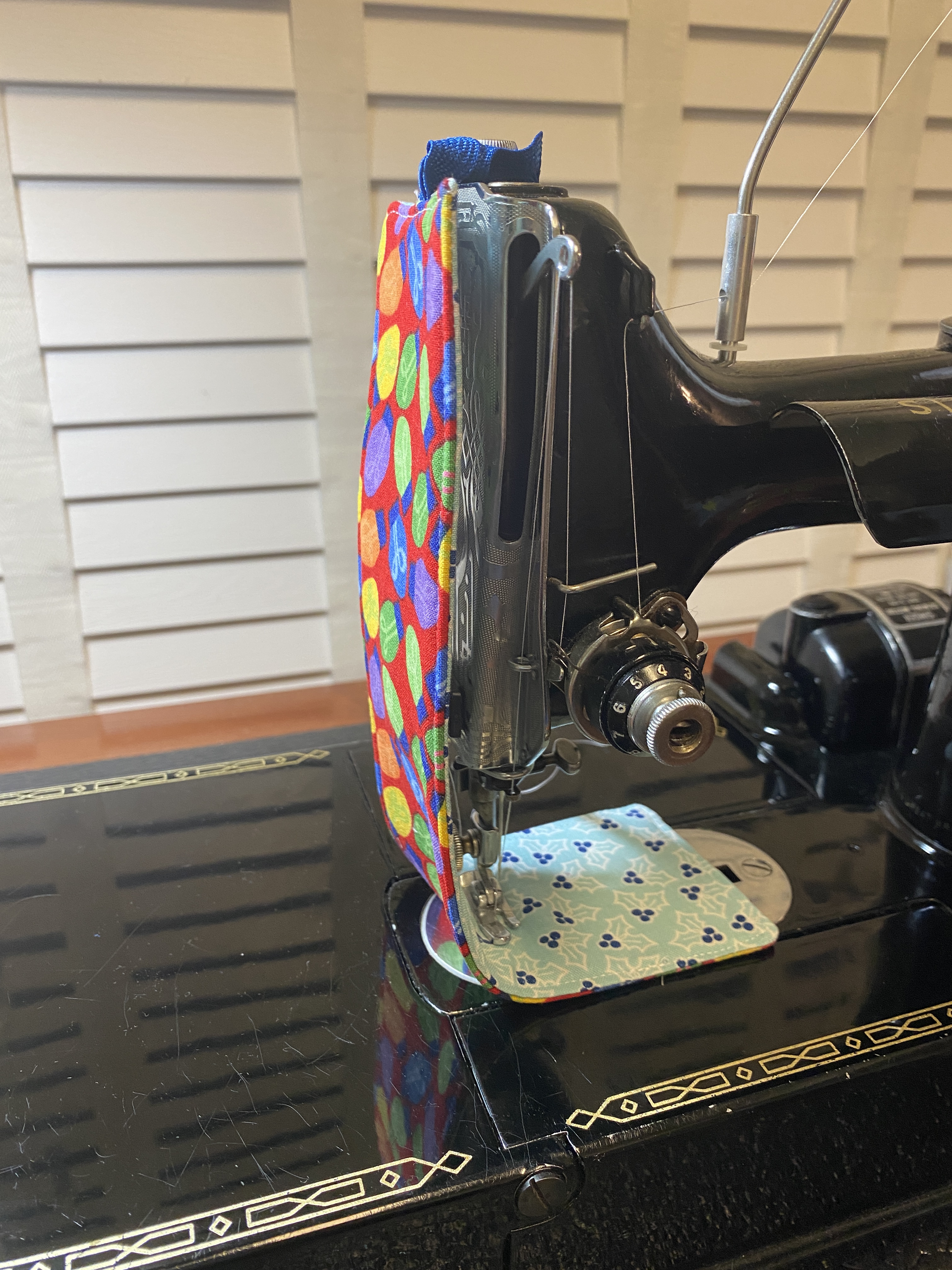 Do you have a Singer 301, Featherweight 221/222 or other vintage machine with a fold-up extension bed? Do the clear silicone bumpers you apply to the faceplate thumbscrew keep falling off? There are other options: make a padded sleeve that fits over the extension bed or make a faceplate cozy that protects your machine bed from the presser foot screw, faceplate screw and any other decorative accessories that might be affixed to your metal faceplate (needle minder or thread cutter perhaps?). I learned about faceplate cozies at a retreat where a fellow sewist had one on her Featherweight.
