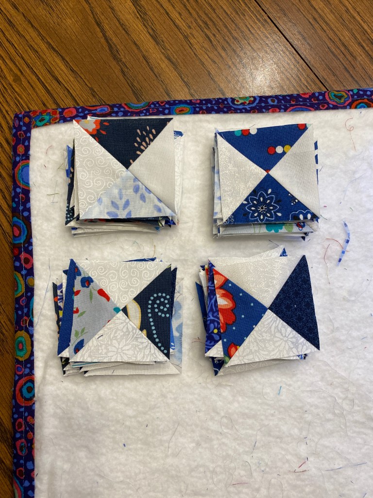 I’m tired. No wonder. I’ve made about 400 little bits in total for this quilt over the past two weeks. I’m all caught up and I’ve successfully figured out how to cut QSTs for the hourglass blocks using Bonnie’s Essential Triangle Ruler. Minimal unstitching and everything turned out the correct size, with only a tiny bit needing to be trimmed away. Last time, I used my Featherweight and the blocks turned out too small. This time, I used my Elnita EC30. Having the ability to adjust the needle position made all the difference for me.