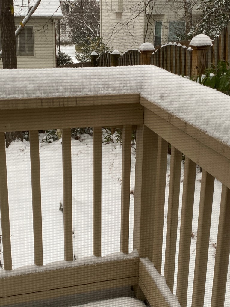 Due to the winter weather, we’ve been stuck at home since Thursday afternoon. Sadie & I went for a short walk yesterday along where the roads and sidewalks were cleared. Hopefully, we’ll be able to get out this afternoon. The snow on our driveway is gone, but we have a swath of ice across the driveway this morning. Rainwater/melting snow from the roof collects in a system that exits from a pop-up near our garage door. Said water flows across the driveway toward the street. The water froze overnight. Once the sun and warmer temps kick in, we’ll try to get to Publix and Home Depot.