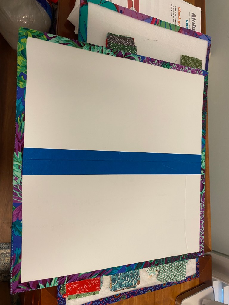 I prefer to make my design boards using self-adhesive foam core board (I find it at Hobby Lobby), felt and the Heat & Bond Ultra (on the roll) method. Note: a glue gun will still come in handy to hold the mitered corners in place. If I can’t find self-adhesive foam core board, I’ll use spray baste to hold the batting/felt in place.