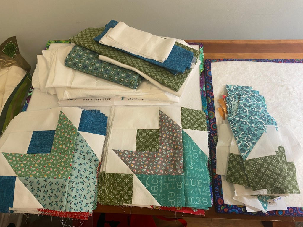 I’m about two-thirds of the way through making blocks. I used a jelly roll and white background fabric from my stash. I purchased the bright blue and green fabrics used as accent squares in each block. The teal print seen in the back stack of fabric will be the binding (and perhaps an outer border once everything is laid out). Backing fabric will be a Lori Holt cheater print that a friend gifted me. My plan was to rent time on the longarm at Tiny Stitches, but available slots are few and don’t mesh with my schedule for the three weeks. I’ll FMQ it on my domestic machine instead since I need it done in time for an event on October 11th.