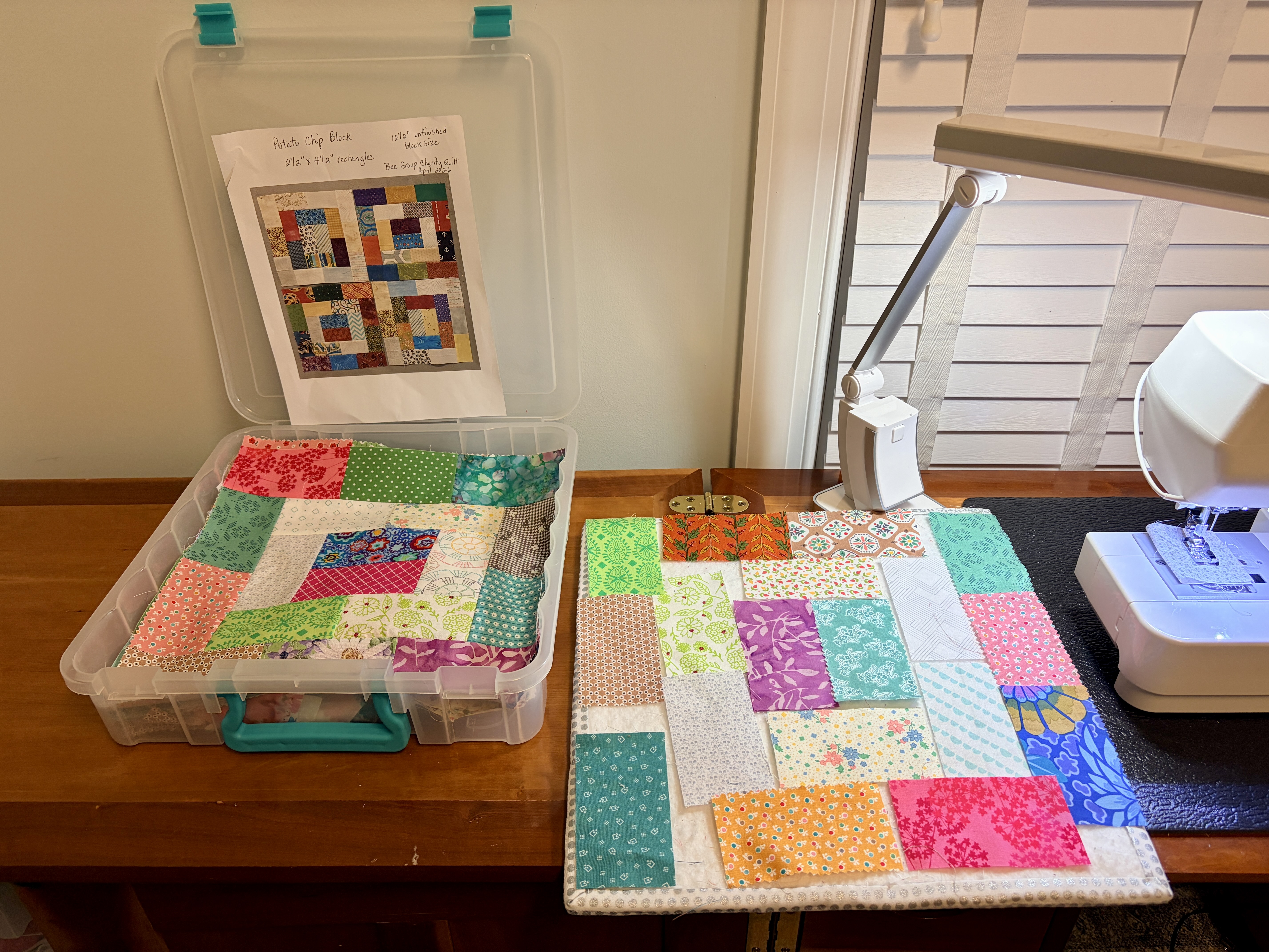 Ever heard of a potato chip block? My bee group selected this block to be the basis for our next round of charity quilts. I cut enough light and dark 2-1/2″ x 4-1/2″ rectangles from my scraps and leftover precuts to fill up the plastic storage box pictured here. I turned in 15 blocks before the April meeting and am currently on block 12 of my second set of 15 blocks. Each block requires a combination of 12 light/6 dark or 6 light/12 dark fabrics with no repeating of fabrics in the same block. My selection of dark fabrics is running low and I’m curious to see how many more “light” blocks I can get out of what’s left. Stay tuned!