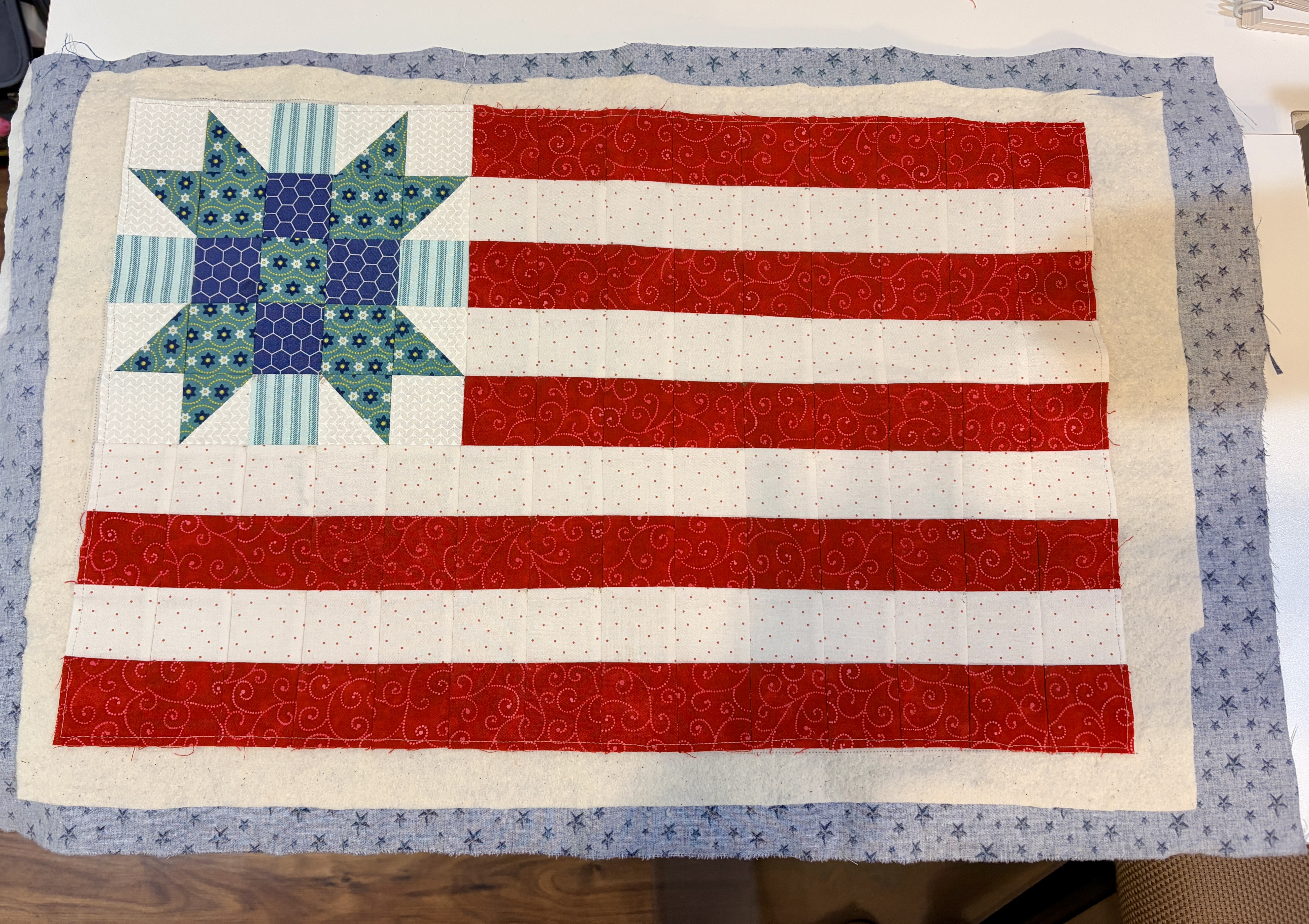 The flag quilt sandwich is my version of the the retreat project shared by a friend attending the JK Quilts Spring Retreat. It uses the fusible grid from Ten Sisters Handicraft along with the Little Flag free pattern from their website. Everything came from my stash. It is ready for FMQ and binding.