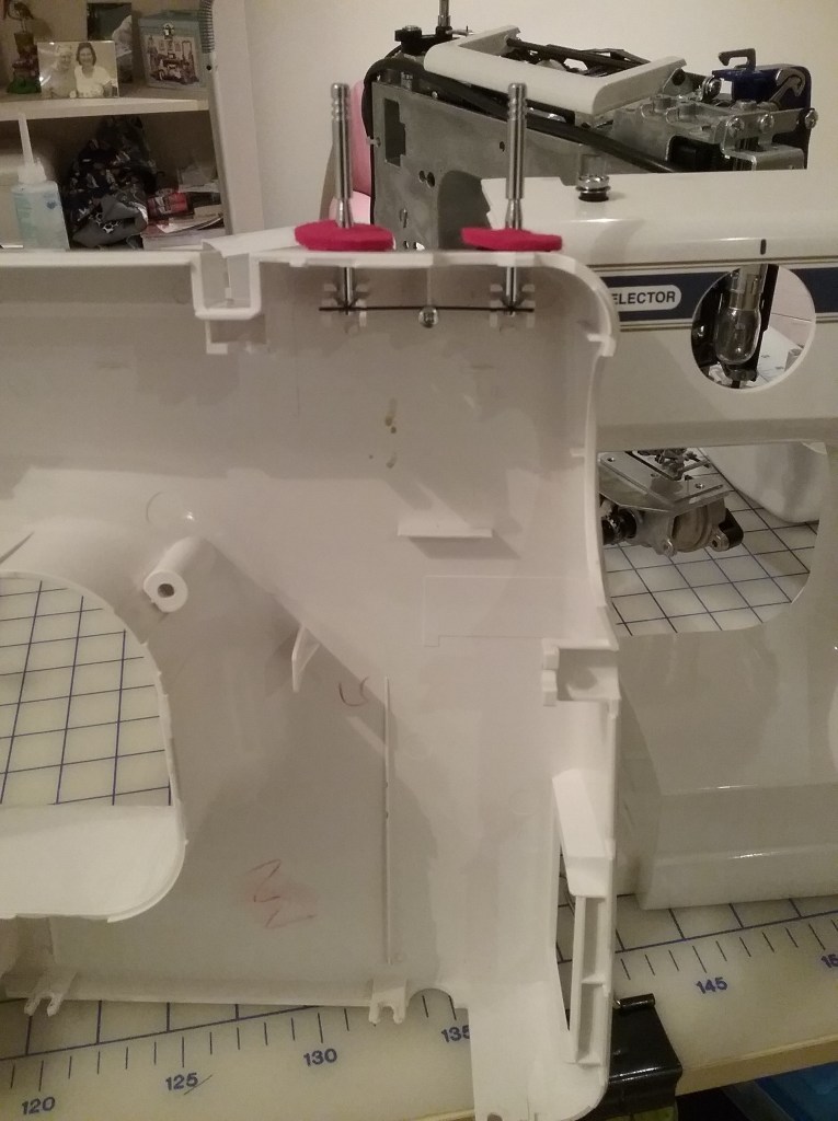 Janome machine disassembled to replace broken plastic spool pins with metal ones.