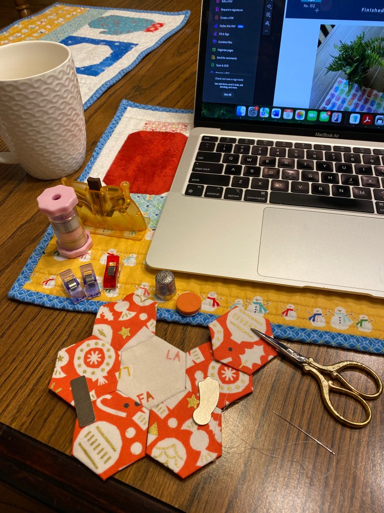 Today was a lazy day. We watched the neighborhood kids slide down the hill in front of our house and visited with the next-door neighbors as their 3 year old experienced snow for the first time. So much fun! I did venture downstairs to my sewing room for a bit, but returned upstairs to the warmth of the fireplace and a mug of hot tea. Making a few EPP hexie flowers, reading a book and taking a nap were about as productive as it got today. Dinner consisted of leftover Hawaiian Chicken, jasmine rice and macaroni salad – my homemade version inspired by Mo’Bettahs that I enjoyed while at the Riley Blake Garden of Quilts event a couple of years ago. There’s even enough left for lunch tomorrow to pair with a small garden salad!