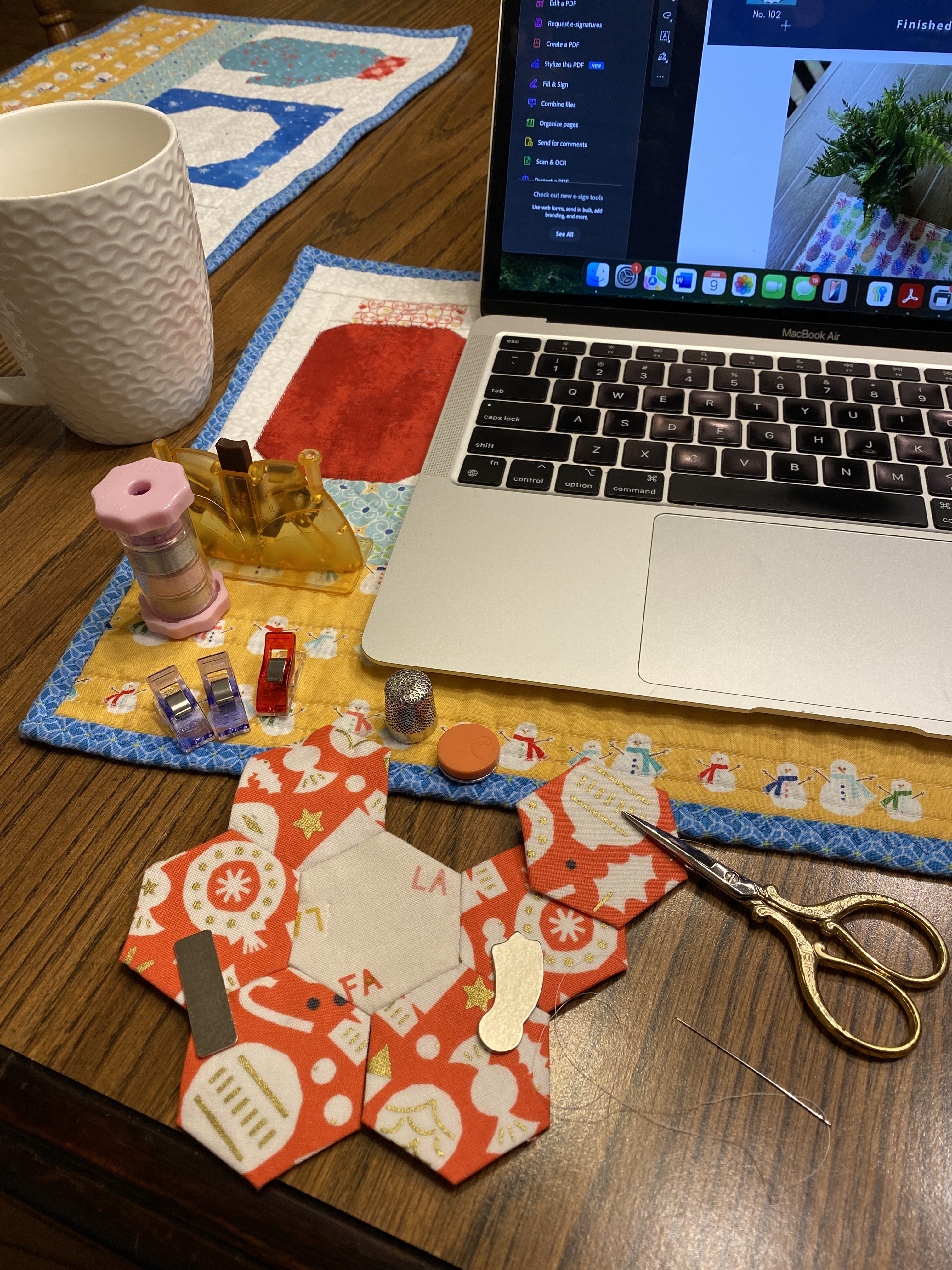 Today was a lazy day. We watched the neighborhood kids slide down the hill in front of our house and visited with the next-door neighbors as their 3 year old experienced snow for the first time. So much fun! I did venture downstairs to my sewing room for a bit, but returned upstairs to the warmth of the fireplace and a mug of hot tea. Making a few EPP hexie flowers, reading a book and taking a nap were about as productive as it got today. Dinner consisted of leftover Hawaiian Chicken, jasmine rice and macaroni salad – my homemade version inspired by Mo’Bettahs that I enjoyed while at the Riley Blake Garden of Quilts event a couple of years ago. There’s even enough left for lunch tomorrow to pair with a small garden salad!